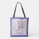 Ladies bag. Design features the recipient's Monogram & Name with Flowers either side in a water colour pastel style. Initial is the letter J. Ladies bag with Floral Design. Gift for Julia.