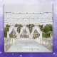 An elegant outdoor wedding rug featuring a light lilac hue with a mother-of-pearl sheen. At its center, the couple's names are monogrammed in an elegant gray script, providing a sophisticated contrast against the delicate backdrop. Intricate patterns or borders may surround the monogram, enhancing its luxurious yet simple feel.