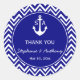 Monogrammed navy blue and white nautical wedding thank you stickers. The design features a navy blue chevron and a white nautical anchor with bride's and groom's initials.