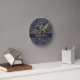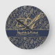 Monogram Navy Blue Gold Leaf Newlyweds Wedding Round Clock