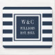 Elegant personalized initials monogram mouse pad featuring a navy blue and white striped pattern with your initials and family name with your established date set in a navy blue-bordered square with a classic white text. Designed by Thisisnotme©