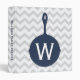 A recipe binder featuring an illustration of a navy blue skillet on front over a gray on gray chevron background. Personalize the front with your monogram. Personalize the text on the spine.