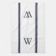 Monogram navy blue striped personalized kitchen towel. Navy blue monogram in classic block text on top and botton border within navy blue striped outer panels. White background.