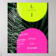 Neon yellow and pink arches over dark palm leaf background. Vertical monogram at top and date at bottom. White line art palm leaf illustration at center.