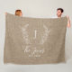 Custom white monogram and name with family established year elegant chic country farmhouse style beige burlap blanket. +++++++ A modern keepsake gift for weddings, anniversaries, housewarmings, Christmas, or any other occasion.
