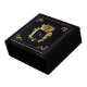 This jewelry keepsake box is shown in the black box color with a sleek black background and a royal looking emblem with a personalized monogram, in center surrounded by a thin border in coordinating color and graced with petite rose sprays. Printed on top. Border shown in royal purple.