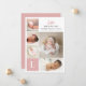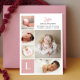 Modern, elegant baby girl birth announcement photo collage card. Design features 5 photos of the baby, single initial monogram on a blush pink background, name and birth stats on the front. Personalize further with your thank you message on the back