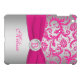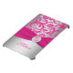 Monogrammed modern and trendy hot pink and silver gray floral damask pattern iPad Mini Case with PRINTED ribbon and PRINTED faux engraved look crystal brooch has template boxes for you to add your name, monogram, initials, logo. or other text to. If you require any assistance, email niteowlstudio@gmail.com.