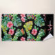 A Colorful Floral Beach Towel ready for a very Tropical atmosphere with Exotic Flowers, Pink Hibiscus and Palm Leaves on a black background. To brighten your Summer Days anywhere you go. You can make it unique by adding your own Monogram and name from the Personalize Menu. You can contact me for any help.