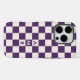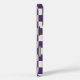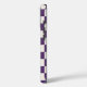 Cool iPhone case features a bold purple and cream checkered pattern with a customizable monogram. Add (or delete) 3 initials in the sidebar to personalize it. The geometric checkerboard pattern is made of rows of alternating beige and purple squares. Other case styles and models also available in the sidebar.