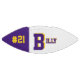 This is a full size football with one panel designed with a monogram name (large first letter) and uniform number, in popular college colors. This one is shown in purple and gold. The football is also available with two white panels so that a 2nd panel may include designs or room for signatures.