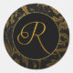 Black and gold Monogram seals with a beautiful scrolling script text art on elegant floral damask. These stickers add a unique touch of class to your wedding invitations!