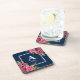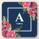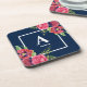 Monogram Red and Pink Flowers Dark Navy Blue Beverage Coaster