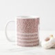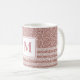 This coffee mug features custom monogram on a beautiful rose gold faux glitter background accented with a transparent white stripe pattern.