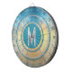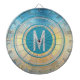 A monogram dart board is a fun way to express your personal style. Design offers a rustic vibe with an array of blue, gold, and gray colors. You can customize with a monogram or letter of your choice. Use the template to create your own monogram dart board.