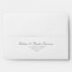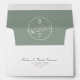 Simple, elegant, modern, minimal sage green 5x7 envelope for wedding invitation with monogram inside, return address and unique romantic couple love birds drawing.