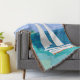 Monogram Sailboat Coastal Tropical Throw Blanket. A sailboat with your name on it approaching a beach. Tropical sea view. Blue, teal, sea foam, turquoise, green, white.