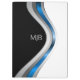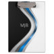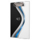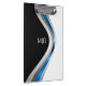 A sleek clipboard design for the modern professional featuring a metallic curves pattern in blue, silver and gray in a curved shape with a black and white background. Personalize the sample text shown in the design template with your monogram, name, logo or other desired text.