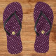 Monogram polka dot flip flops. Small white polka dots on a purple background with a round yellow monogram.