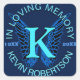 Square monogram memorial tribute sticker in blue and neon blue colors.