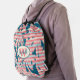This drawstring bag features your monogram initial and name on a collage of palm trees and teal, yellow, coral and blue stripes. Create for yourself or give as a gift.