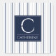 Chic nautical white and navy blue design featuring stripes and your name and initial inside the dark navy square frame. Fresh, preppy summer style.