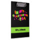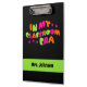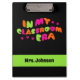 This clipboard was made especially for teachers. You can customize it with your name. The clipboard features the words, "In My Classroom Era" in fun wavy lettering. The words also appear on the back of the design. Copyright Kathy Henis