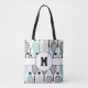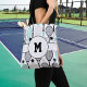 Sporty monogram tennis tote bag featuring a stylish pattern of tennis rackets and balls in black, grey, and teal. Perfect for tennis players, coaches, and fans to carry gear, snacks, or personal items to matches, practice, or tournaments. Customize with your initial or name for a personal touch. Makes a thoughtful gift for birthdays, team celebrations, or tennis-loving friends. Durable and versatile for both on and off the court.