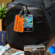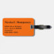 Luggage tag with a picture of fishing lures, monogram initial(s)/name on a black stripe monogram frame, name, and address information on an orange background. Personalize with your monogram initial(s)/name, name, and address information using the easy templates. Font color, font style, font size, and orange background color are customizable.