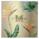 Bring a bit of elegant tropical hospitality to your home all year long whenever you use this chic, modern custom monogram ceramic tile. Stunning, sophisticated, colorful, tropical watercolor birds of paradise flowers, faux gold glitter, and personalized calligraphy script with a bold monogram initial, overlay a stylish, glam brushed gold foil background. Personalize with your name and monogram. Available in 2 sizes: 4.25” square or 6” square. Makes a great housewarming gift!