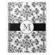 A custom initial notebook with an elegant damask pattern of vintage daisies and leaves with scrolls in black on white. Customize it to change background colors and more.
