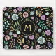 Whimsical boho floral pattern, bold colors, trendy floral design. Flowers, leaves, buds and berries. Pink, blue, green, golden (color), purple and orange. Black background makes the colors pop. Black + golden monogram (gold is not real gold but color).