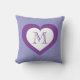 This pillow features a white and purple heart containing a monogram initial on one side and a repeating purple heart pattern on the other. Click "Customize it!" button to re-size/re-position purple heart image, change background color and/or personalize text.
