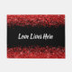 Welcome guests with warmth and style using our elegant monogram doormat. This beautiful doormat features the endearing phrase "Love Lives Here" in white text, standing out against a bold black background. The top and bottom edges are adorned with a shimmering red glitter border, adding a touch of glamour and sophistication to your entryway.