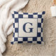 Stylish pillow features a large custom monogram in the center within an off-white square with a navy and cream checkered border pattern. Add your initial in the sidebar. Alternating navy blue and beige squares form the bold geometric pattern around the edges.