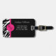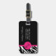 Travel in style with our personalized monogram zebra stripe luggage tag that features white zebra stripes and a pink accent border on a black background with a round pink accent frame for your initials and your information on the front. The back of the luggage tag features white zebra stripes on a black background. A cool and fun way to decorate and identify your luggage. Show your personality with this fun and trendy luggage tag. Makes a great gift for all occasions. Customize with your personal or business information. Click the "Customize it!" button to change the font size, font color, font style and more!