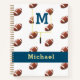 Front design features a white background to a pattern of footballs. Image of a goalpost is displayed in center with the initial you supply in an ocean-blue font. Name is displayed in gold against an ocean-blue strip at bottom. Reverse features a solid ocean-blue background with initial at bottom right in a gold-colored font.