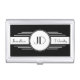 Black and White Business Card Holder. Initials are framed in a white circle with black pinstripe border. White stripes with first and last name flank monogram.
