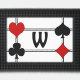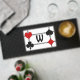 Serve your guests in style at your next Poker Night or Card Party with this bar mat. Featuring an Art Deco inspired original design w/a card playing theme composed of bright red & black card suit symbols (diamond, club, heart & spade) centered where the black thick & thin horizontal & vertical lines of a grid meet, w/a large custom text field for your monogram in the center.
