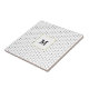 A black polka dot pattern is on a white background. Black monogram is on a white square in the center. The square has a faux (no foil) gold trim.