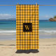 Monogrammed beach towel featuring a beige brown checked plaid pattern and a personalized beige monogram in a dark brown rectangle int he center.