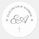 Monogrammed Catholic sticker design features the initials of the bride and groom in a large, elegant silver font displayed as main design. First names of bride and groom are displayed as an arch above. A small, silver cross is featured just below. Designed to accompany the "Catholic Elegance Wedding Suite".