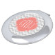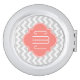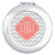 A compact mirror with a quatrefoil in a spring shade of coral, a silver and white chevron pattern and your initial monogram, the perfect patterned elegant gift for her birthday, an anniversary, Christmas, Valentine's Day, Sweet 16, congratulations, graduation, wedding favor for bridesmaid, flower girl, sister, wife, Aunt, Mother, Mother to be, daughter, cousin, wife, fiance, girlfriend, daughter in law, niece, mother in law, friend, like a mother, like a sister, best friend, grandmother, granddaughter, godmother, goddaughter, teacher, babysitter, I'm sorry, Mother in law to be, like a daughter