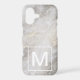 Contemporary iPhone case features trendy gray marble texture and bold white monogram at the bottom.