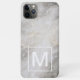 Contemporary iPhone 11 Pro Max phone case features trendy grey marble texture and bold white monogram at the bottom.