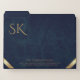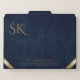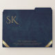 This design features elegant and professional luxurious navy blue leather textured borders, with minimalist gold accents and customizable monogram custom file folders. Perfect for luxury corporate branding, businesses looking for premium, high quality office supplies for clients, employees or executives.
