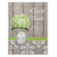 Pretty rustic style monogrammed mason jar binder with a green hydrangea flower and a wooden fence and antique damask pattern lace background and stitched green ribbon. This wedding or bridal shower or couples shower guest book and words of advice book can be personalized with the initials and monogram of the bride and groom on the mason jar and customized with the names of the happy couple. Perfect for a country, farmhouse, garden party or barnyard style wedding or shower. Designed by Chrissy H. Studios, LLC. All rights reserved.