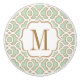 Add your monogram or initial to the bracket shaped center design on a mint green and gold quatrefoil pattern. This exotic and elegant Moroccan style inspired pattern in pale green jade, white and goldish brown is perfect for the woman with a preppy, stylish and modern style. Artwork © Chrissy H. Studios, LLC. All rights reserved.