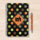Features an orange, green, brown and taupe polka dot pattern on a black background with a central orange diamond in orange with an editable monogram in black. Edit or delete the text in the text box provided. Created by Evco Studio www.zazzle.com/store/evcostudio