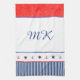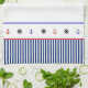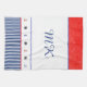 Nautical themed hand towel with blue and red anchors and steering wheels. It says, "Wipe away the sand, but not the memories."